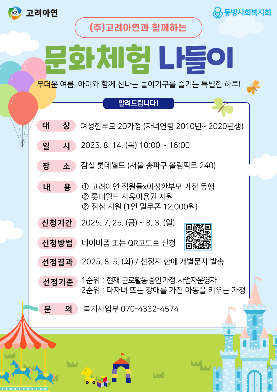 동방사회복지회에서는 2025년 (주)고려아연과 함께하는 롯데월드 문화체험 나들이 참여자를 아래와 같이 모집합니다.