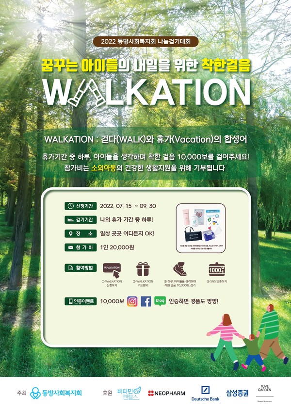WALKTION은 걷기(WALK)와 휴가(VACATION)의 합성어로 휴가 기간 동안 하루, 소외 이웃을 생각하는 착한 걸음으로 나눔을 실천하는 참여형 나눔 캠페인이다.참가 접수는 동방사회복지회 홈페이지(https://www.eastern.or.kr/)에서 신청할 수 있으며 참가자에게는 마스크, 비타민, 톤업 선크림, 돗자리, 비누 등 일상생활에서 유용하게 사용할 수 있는 물품으로 구성된 WALKATION키트가 배송된다. 참가비 2만 원은 소외 아동의 건강한 생활지원을 위해 기부된다. 또한, 대회 기간 동안 10,000보 달성, 개인 SNS에 참여 인증샷 업로드를 한 시민 가운데 추첨을 통해 경품을 선물하는 이벤트가 진행된다.