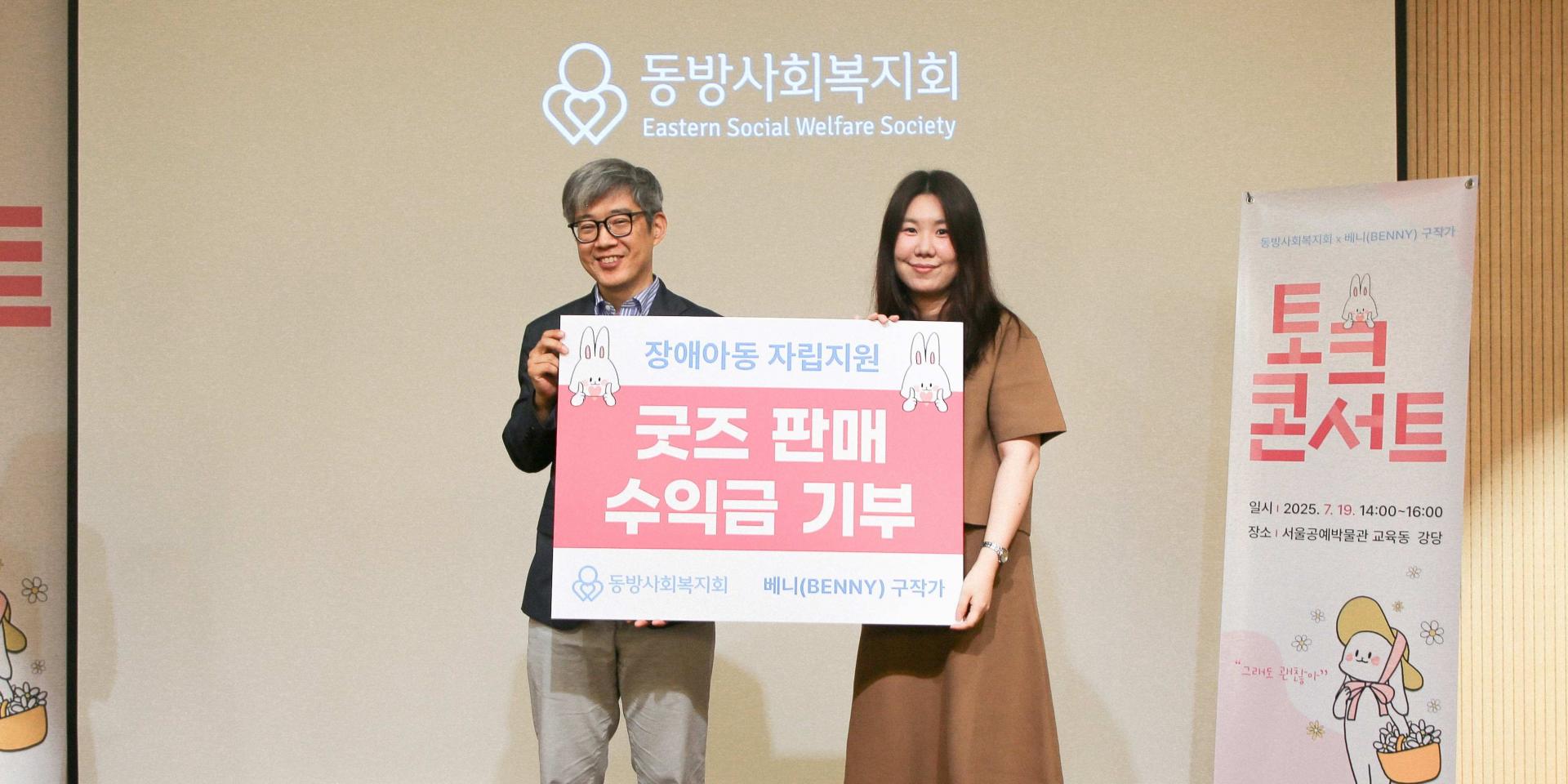 7월 19일, 서울공예박물관에서 열린 <동방사회복지회 X 베니(BENNY) 구작가 토크콘서트>가 102명의 시민이 함께한 가운데 따뜻한 여운을 남기며 마무리되었습니다. 이번 행사는 장애아동의 자립을 지원하기 위해 동방사회복지회가 주최했으며, 예술을 통한 나눔 실천과 기부 문화 확산을 위한 의미 있는 자리로 마련되었습니다.